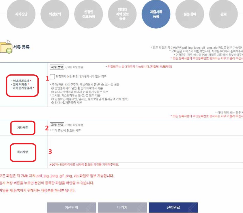 - 묵시적 계약 연장 경우 임대인과 협의한 계약기간을 적어야 하며 해당 내용을 신청절차 마지막 특이사항 란에 기재