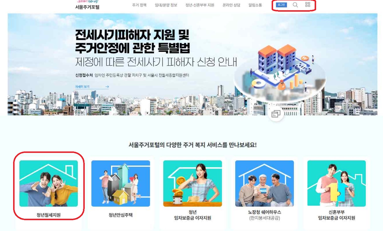 서울주거 포털접속 및 서울시 통합 로그인후 청년월세지우너 클릭