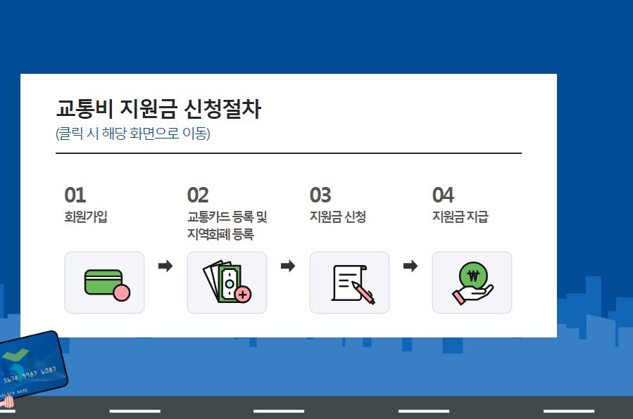 - 신규 회원가입 → 교통카드등록 → 지역화페 등록 → 신청